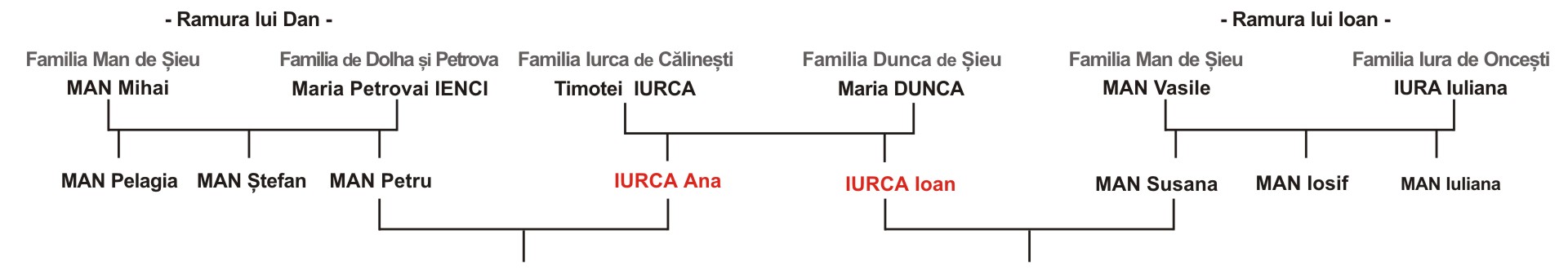 Revenim la familiile Iurca și Man. Timotei Iurca, căsătorit cu Maria, a avut doi urmași: Ioan Iurca, care s-a căsătorit cu Susana Man, și Ana Iurca, care s-a căsătorit cu Petru Man (vicepretor la 1867), aparținând celeilalte linii genealogice a Familiei Man de Șieu – antecesorii mei [2]. Înclin să cred că e foarte rară situația ca două mari linii genealogice provenind de la aceeași familie să fie reunite prin căsătoria cu doi descendenți, frate și soră, a unei alte familii, în același timp: în cazul de față, Ioan și Ana Iurca de Călinești, căsătoriți cu Susana Man (de pe linia lui Ion) și Petru (de pe linia lui Dan), pomeniți în Enciclopedia familiilor nobile Maramureșene de origine română a lui Al. Filipașcu (p. 156).