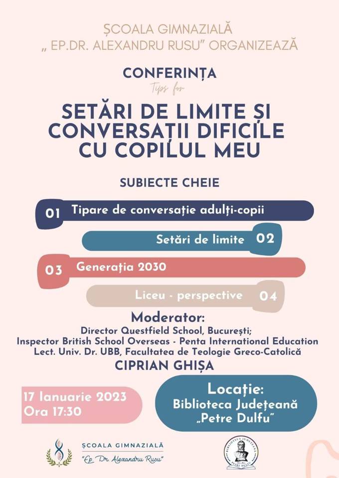 Școala „Ep. Dr. Alexandru Rusu” organizează conferința pentru părinți cu titlul „Setări de limite și conversații dificile cu copilul meu”. Subiecte cheie abordate: tipare de conversație adulți-copii, setări de limite, generația 2030, liceu – perspective.