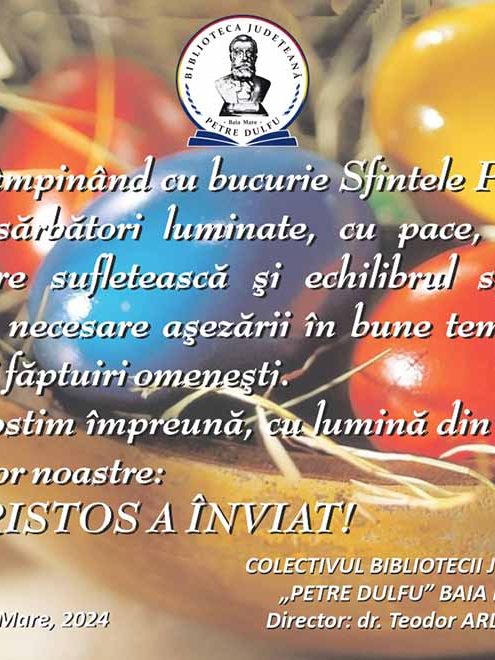 Întâmpinând cu bucurie Sfintele Paști, vă dorim sărbători luminate, cu pace, liniște, împăcare sufletească și echilibru spiritual atât de necesare așezării în bune temeiuri a oricărei făpturi omenești. Să rostim împreună, cu lumină din lumina sufletelor noastre: HRISTOS A ÎNVIAT! Conducerea Bibliotecii Județene „Petre Dulfu” Baia Mare Baia Mare, 2024
