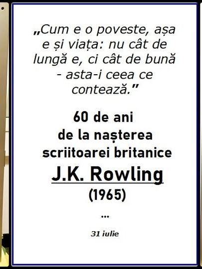 „Cum e o poveste, așa e și viața: nu cât de lungă e, ci cât de bună – asta-i ceea ce contează” . 60 de ani de la nașterea scriitoarei britanice J.K. Rowling (1965) vitrină de carte realizată la Compartimentul Multiculturalia – 31 iulie Joanne K. Rowling [ˌd͡ʒəʊˈæn ˈkeɪ ˈrəʊlɪŋ] (cunoscută ca…
