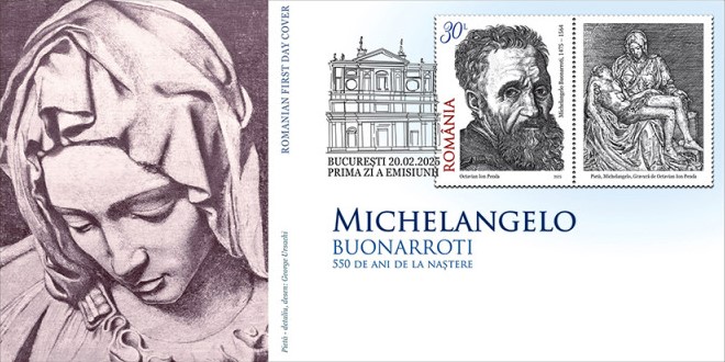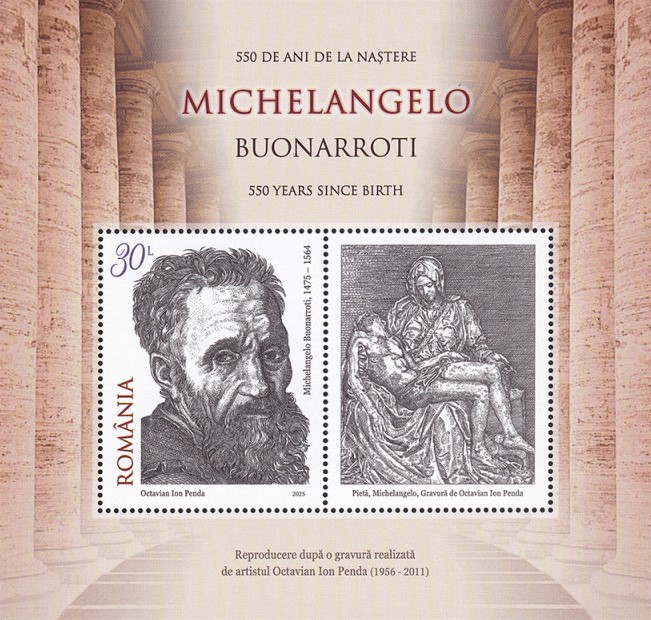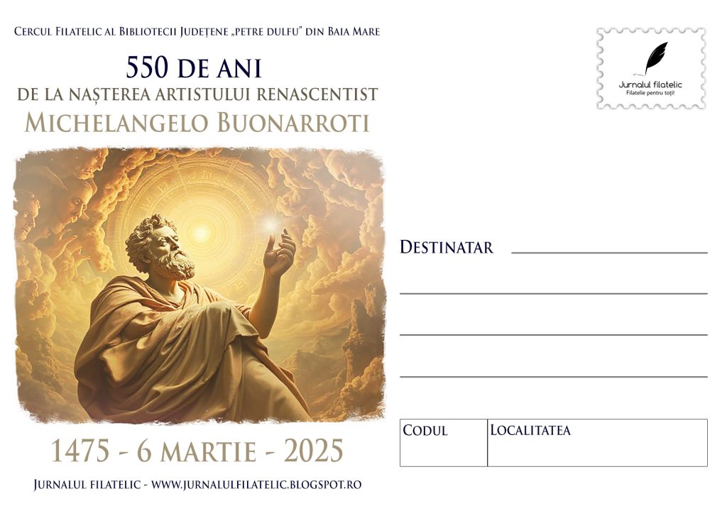 Romfilatelia a omagiat marea personalitate a Renașterii italiene prin punerea în circulație a emisiunii filatelice „Michelangelo Buonarroti, 550 de ani de la naștere” (LP #5804) compusă dintr-o coliță filatelică dantelată și un plic „prima zi”.