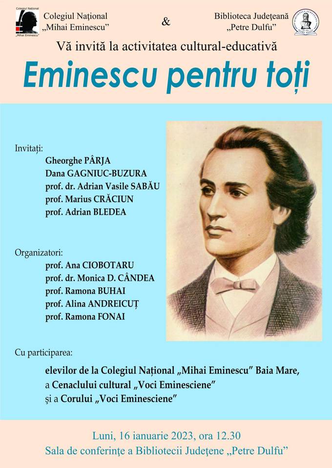 Colegiul Național „Mihai Eminescu” în colaborare cu Biblioteca Județeană „Petre Dulfu” organizează activitatea cultural-artistică „Eminescu pentru toți”.