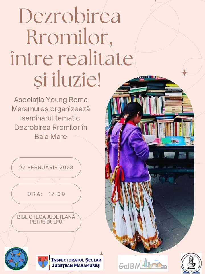 Biblioteca Județeană „Petre Dulfu” în colaborare cu Asociația „Young Roma”, Inspectoratul Școlar Județean Maramureș și Asociația GAL Baia Mare organizează seminarul tematic „Dezrobirea romilor, între realitate și iluzie!”.