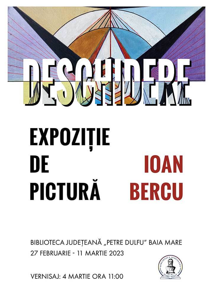 Biblioteca Județeană „Petre Dulfu” organizează vernisajul expoziției de pictură intitulată „Deschidere” a pictorului băimărean Ioan Bercu. Este prima ieșire pe simeze în Maramureș a acestuia, cu o selecție în registrul geometric și abstract. Expoziția catalogată va avea loc în Salonul Artelor, iar în Cabinetul Medaliilor vizitatorii vor avea acces la patru serii de format mic cu prezentare directă, în ziua vernisajului. În prima sa expoziție a anului, artistul deschide privitorilor o tehnică nouă în pasteluri geometrice. Expoziția va putea fi vizitată din data de 27 februarie până în 11 martie.