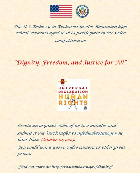 Ambasada S.U.A. la București invită liceenii cu vârste cuprinse între 16-18 ani să participe la o competiție de clipuri video pe tema „Demnitate, libertate și dreptate pentru toți”.