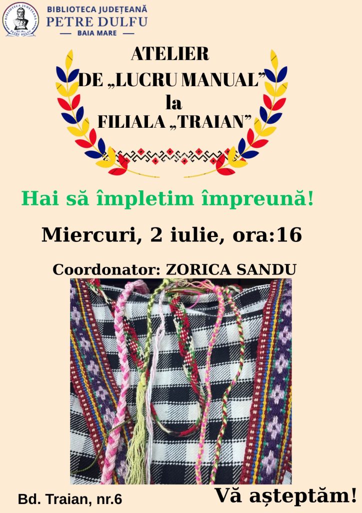 EDIT: Având în vedere că în cadrul filialei se desfășoară operațiuni de dezinsecție și deratizare, vă anunțăm că activitatea de mâine din cadrul ,,Atelierului de lucru manual” se va reprograma.