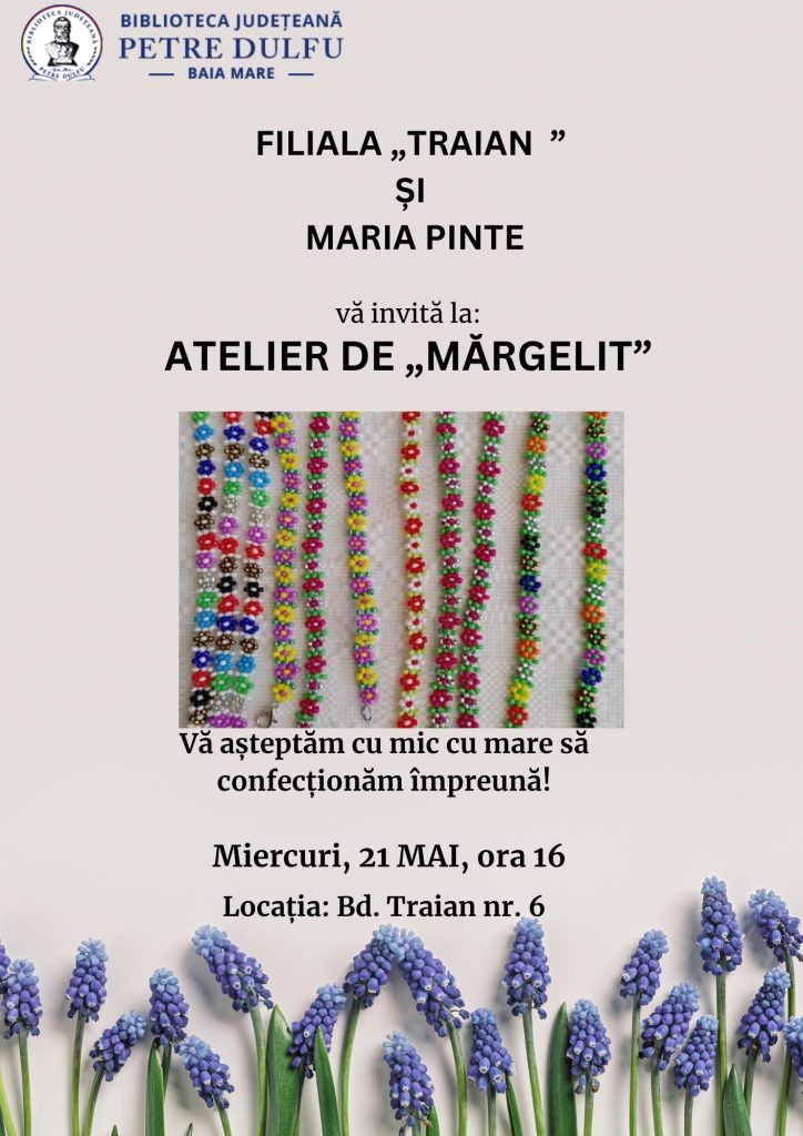 Vă așteptăm miercuri, 21 mai, de la ora 16, să veniți cu mic cu mare la „Atelierul nostru de mărgelit”, să ne facem propria brățară sau să învățăm și alte tehnici de lucru cu mărgelele. Cea care ne va învăța va fi Maria Pinte, căreia îi mulțumim pentru implicarea în diferite proiecte.