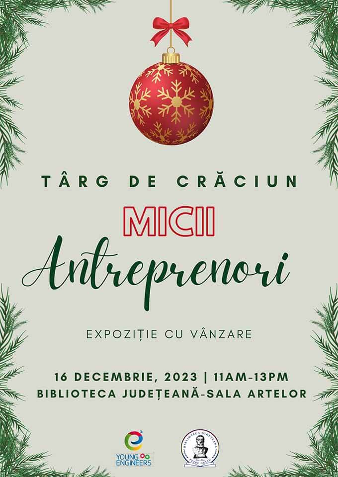Asociația „Young engineers” organizează atelierul de Crăciun intitulat „Micii antreprenori” pentru copiii membrilor asociației. Produsele rezultate vor fi expuse și vor putea fi achiziționate de către părinți. Persoană de contact: Radu Vălean.