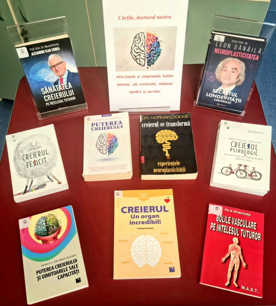 Expoziţia de carte cu tema „Afecțiunile și simptomele bolilor mintale, ale creierului, măduvei spinării și nervilor” cuprinde o selecție de cărţi interesante, care oferă informații prețioase legate de bolile creierului, măduvei spinării și ale nervilor. Printre cele mai importante afecțiuni amintim: durerea, cefaleea, amețeala, vertijul, tulburările de somn, delirul, demența, coma, crizele epileptice, AVC-ul, traumatismele craniene, tumorile sistemului nervos, infecțiile creierului, măduvei spinării, scleroza multiplă, precum și simptomele lor.