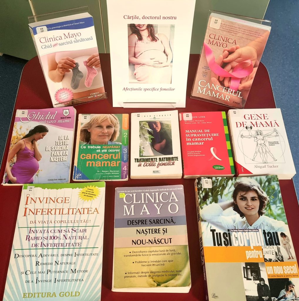 Expoziţia de carte cu tema „Afecțiunile specifice femeilor” cuprinde o selecție de cărţi interesante, care ne oferă informații legate de simptomele și diagnosticul afecțiunilor ginecologice, menopauza, infertilitatea, sarcina normală și cu risc înalt, travaliul și nașterea normală, complicațiile nașterii, disfuncția sexuală, afecțiunile mamare, endometrioza, infecțiile vaginale, cancerele sistemului reproducător feminin și multe altele.