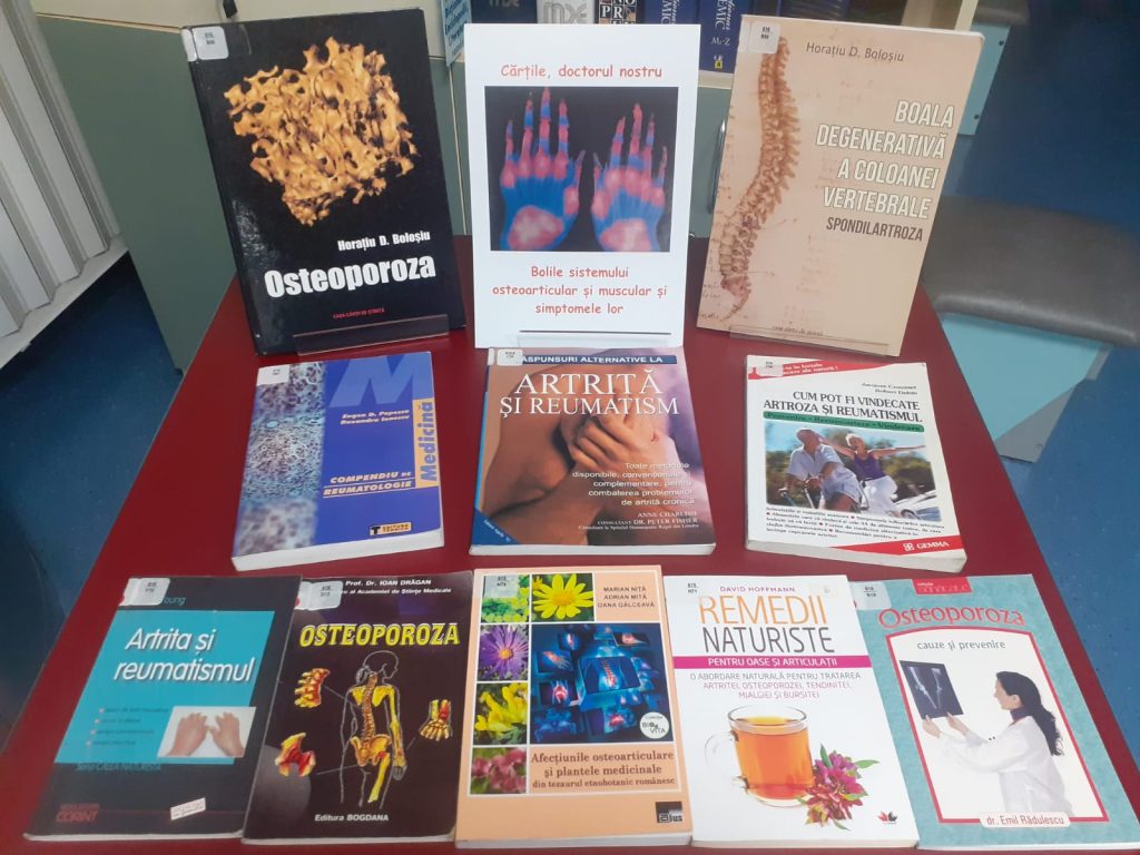 Expoziția cu tema „Cărțile, doctorul nostru”, cuprinde o selecție inedită de cărţi, care oferă informații importante, legate de afecțiunile și simptomele bolilor sistemului osteoarticular și ale sistemului muscular, dintre care amintim: osteoporoza, fracturile, tumorile oaselor, osteoartrita, poliartrita reumatoidă, vasculitele, guta, bolile mâinilor și ale picioarelor, distrofia musculară, afecțiunile mușchilor și multe altele.