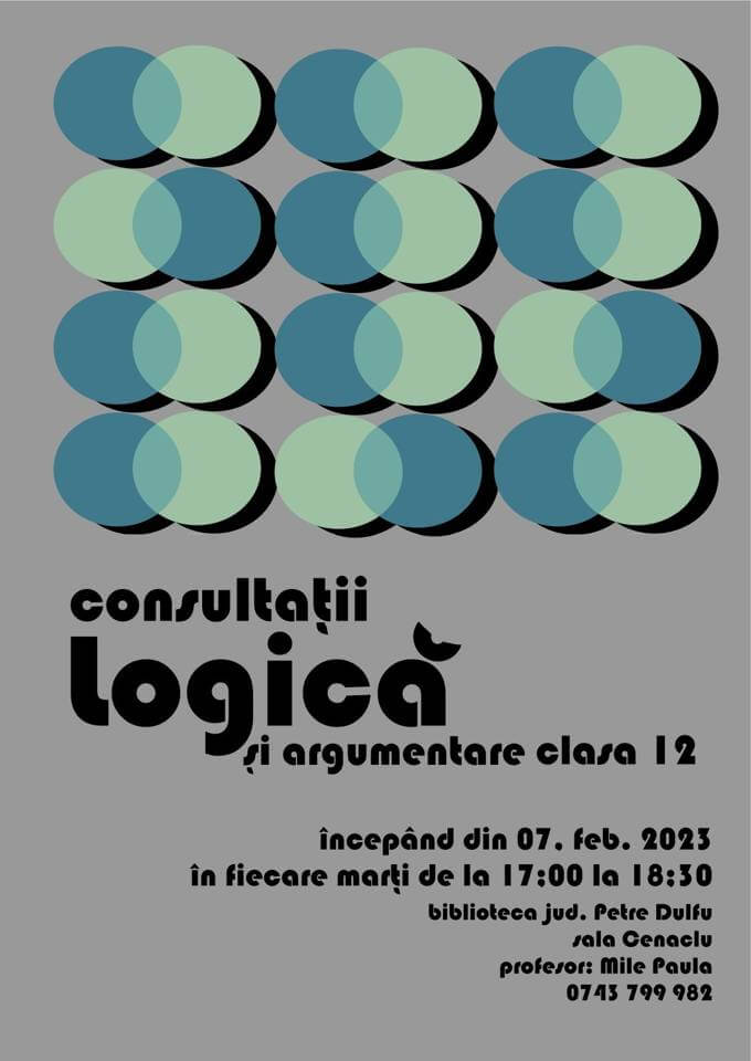 Începând cu marți, 7 februarie, ora 17, la Sala Cenaclu „Ion Burnar” a Bibliotecii Județene „Petre Dulfu”, va avea loc deschiderea Cercului de logică – Consultații logică și argumentare, clasa a XII-a. Coordonator: prof. Paula Mile (Detalii la tel: 0743.799.982).