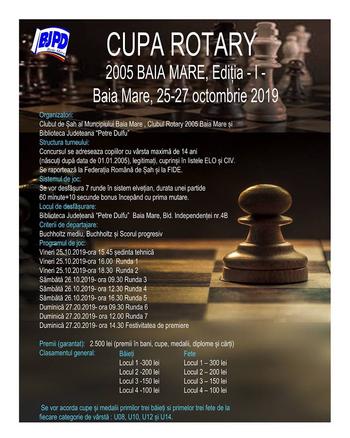 În perioada 25 – 27 octombrie 2019, va avea loc Concursul de şah „Cupa Rotary 2005 Baia Mare”, ediţia I.