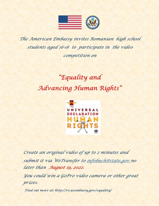 Ca parte a campaniei de creștere a respectului și a gradului de conștientizare pentru drepturile omului, prin reducerea inegalităților, Ambasada S.U.A. la București invită liceenii cu vârste cuprinse între 16-18 ani să participe la o competiție de clipuri video pe tema „Egalitate și promovarea drepturilor omului”.