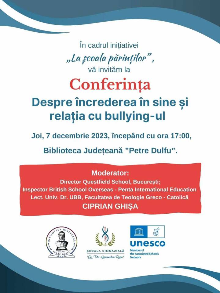 Școala „Ep. Dr. Alexandru Rusu” organizează în cadrul inițiativei „Școala părinților”, conferința „Despre încrederea în sine și relația cu bullying-ul”.