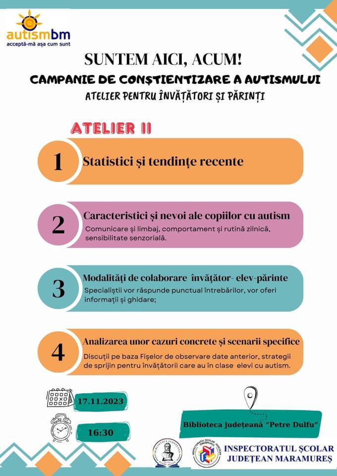 Inspectoratul Școlar Județean Maramureș în colaborare cu Asociația Autism Baia Mare organizează conferința „Suntem aici, acum!” – atelier II.