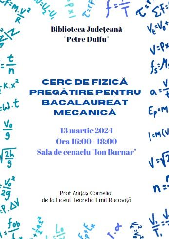 Începând de miercuri, 6 martie 2024, de la ora 16.00, în Sala de cenaclu „Ion Burnar” a Bibliotecii Județene „Petre Dulfu” Baia Mare vor avea loc consultații gratuite la fizică pentru elevii claselor a XII-a.