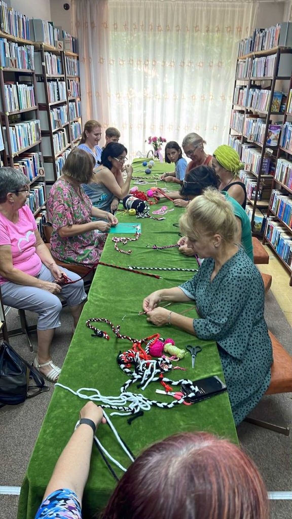 Ieri am avut o zi specială la „ Atelierul de lucru manual”, s-au împletit povești de demult, despre cum se împletea un baier la traistă, iar azi am mai adăugat și brâie, brățări cu „pui” sau alte modele sub îndrumarea păstrătoarei de tradiții Zorica Sandu. Foarte dibaci cei prezenți în a împleti, astfel au ieșit din mâinile lor adevărate podoabe.