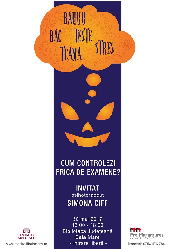 Asociaţia „ProMaramureş” în colaborare cu Centrul de Meditaţii Baia Mare organizează atelierul interactiv „Cum controlezi frica de examene?”. Evenimentul este dedicat elevilor din anii terminali de gimnaziu și liceu, participarea fiind gratuită.