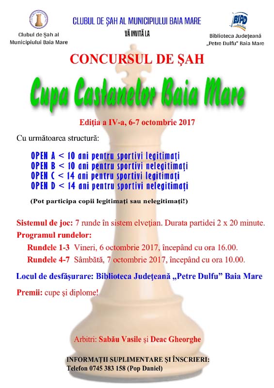 Clubul de Şah al Municipiului Baia Mare (coordonator ing. Daniel Pop) şi Biblioteca Judeţeană „Petre Dulfu” organizează „Cupa Castanelor la şah” – concurs pentru copii, ediţia a IV-a.