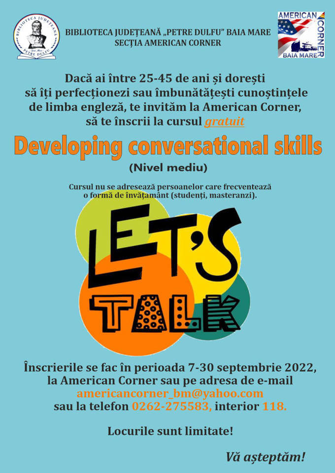 Dacă ai între 25-45 de ani și dorești să îți perfecționezi sau îmbunătățești cunoștințele de limba engleză, te invităm la American Corner, să te înscrii la cursul gratuit „Developing conversational skills” (nivel mediu). Cursul nu se adresează persoanelor care frecventează o formă de învățamânt (studenți, masteranzi).