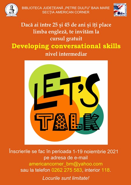 Dacă ai între 25-45 de ani și dorești să îți perfecționezi cunoștințele de limba engleză, te invităm la American Corner, să te înscrii la cursul gratuit „Developing conversational skills”.