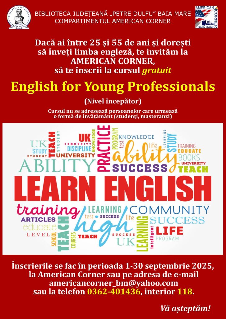 Dacă ai între 25-55 de ani și dorești să înveți limba engleză, te invităm la American Corner, să te înscrii la cursul gratuit „English for Young Professionals” (nivel începător).