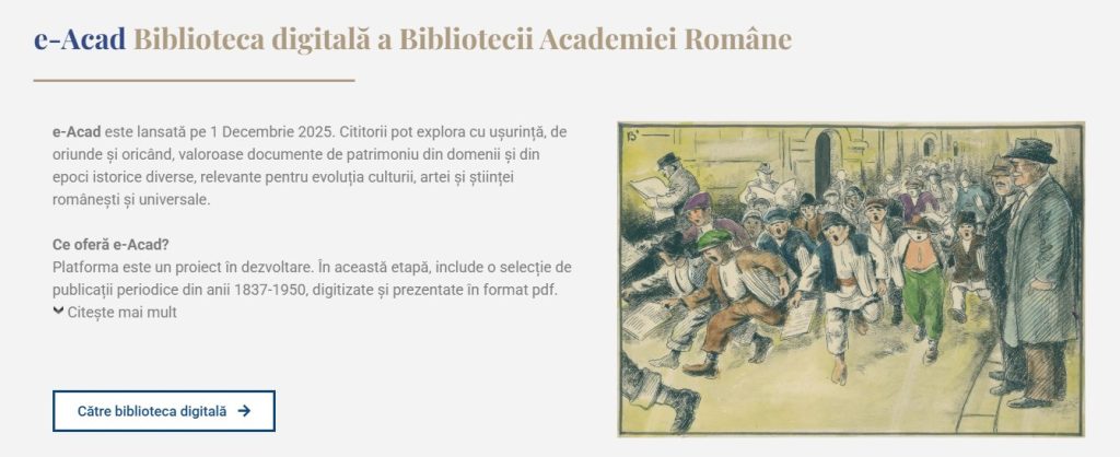 Pe 1 Decembrie 2025, de Ziua Națională, Biblioteca Academiei Române a lansat e-Acad, biblioteca sa digitală.
