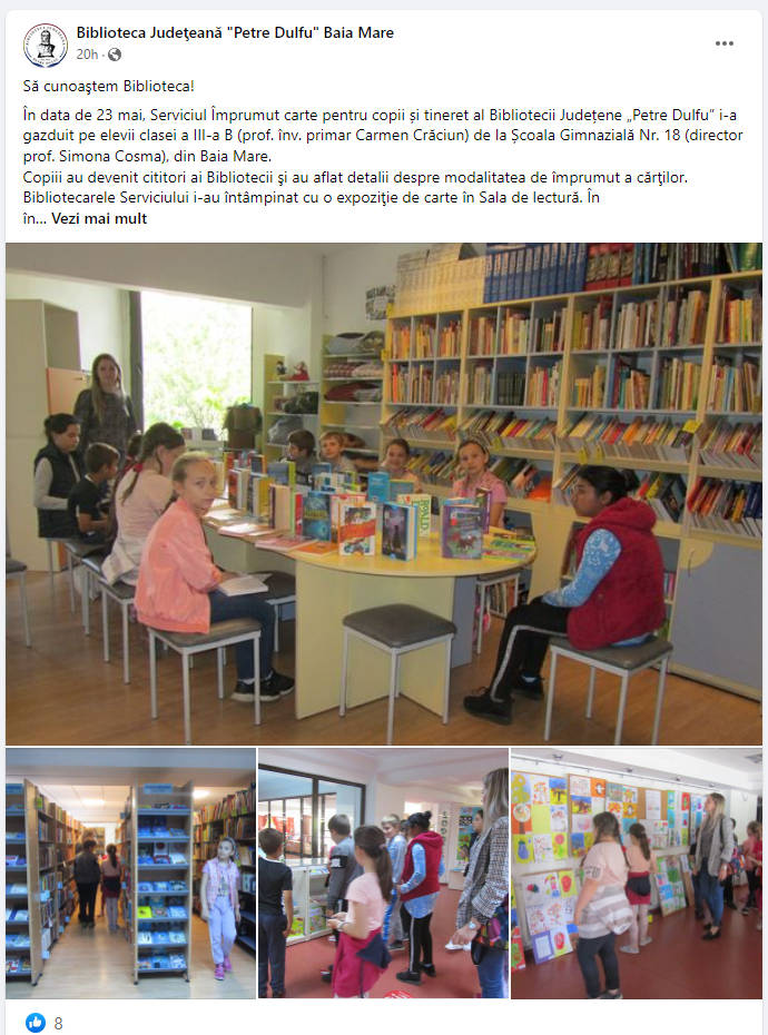 În data de 23 mai, Serviciul Împrumut carte pentru copii și tineret al Bibliotecii Județene „Petre Dulfu” i-a gazduit pe elevii clasei a III-a B (prof. înv. primar Carmen Crăciun) de la Școala Gimnazială Nr. 18 (director prof. Simona Cosma), din Baia Mare.