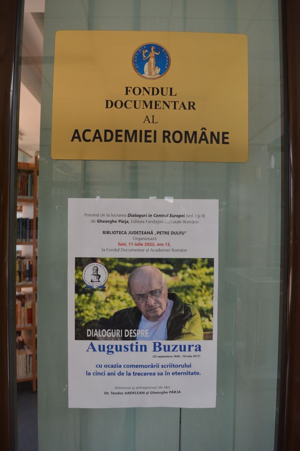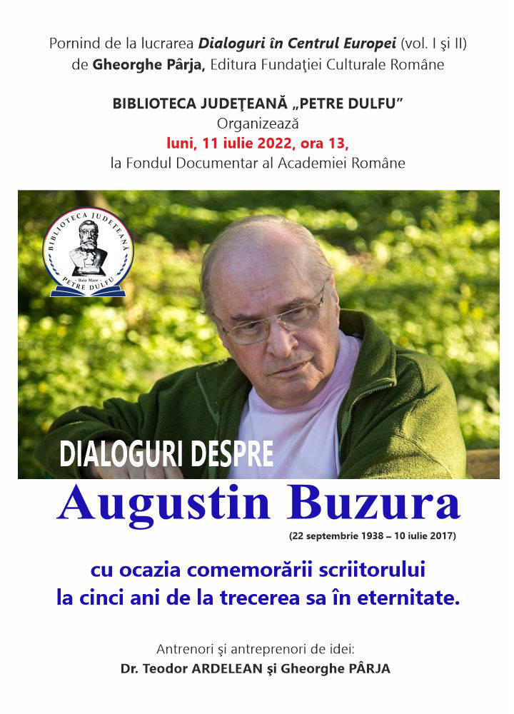Luni, 11 iulie, la Fondul Documentar al Academiei Române, pornind de la cartea „Dialoguri în Centrul Europei” (vol. I și II), de Gheorghe Pârja, apărută la Editura Fundației Culturale Române, Biblioteca Județeană „Petre Dulfu” a organizat activitatea „DIALOGURI DESPRE AUGUSTIN BUZURA” (22 septembrie 1938 – 10 iulie 2017), cu ocazia comemorării scriitorului, la cinci ani de la trecerea sa în eternitate. Volumele amintite reprezintă o culegere de interviuri ale jurnalistului Gheorghe Pârja cu participanți la cursurile de limbă, cultură și civilizație românească organizate începând cu anul 1995, de Fundația Culturală Română, al cărei președinte a fost academicianul Augustin Buzura.