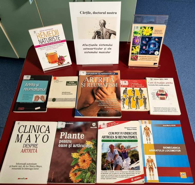 Expoziţia cu tema „Cărțile, doctorul nostru”, cuprinde o selecţie inedită de cărţi, care oferă informații importante, legate de afecțiunile sistemului osteoarticular și ale sistemului muscular, dintre care amintim: osteoporoza, fracturile, tumorile oaselor, osteoartrita, poliartrita reumatoidă, vasculitele, guta, bolile mâinilor și ale picioarelor, distrofia musculară, afecțiunile mușchilor și multe altele.