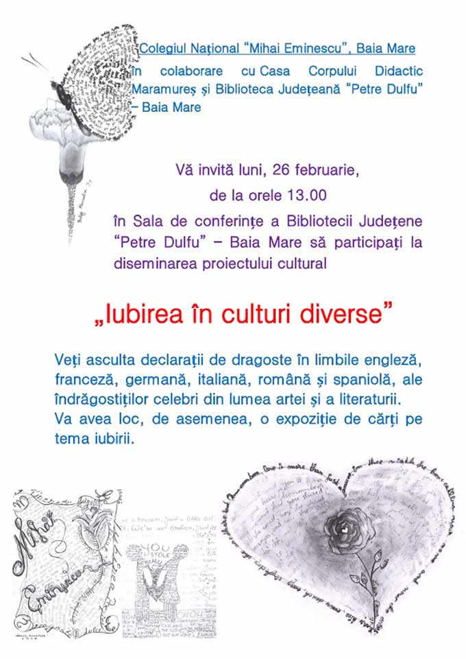 Colegiul Naţional „Mihai Eminescu” în colaborare cu Casa Corpului Didactic şi Biblioteca Judeţeană „Petre Dulfu” organizează în preajma sărbătorii de Dragobete, o activitate cu titlul „Iubirea în culturi diverse”.