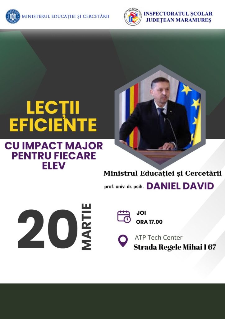 „Ne bucură foarte tare interesul manifestat pentru conferința organizată de Inspectoratul Școlar Județean Maramureș cu domnul Daniel David, ministru al Educației și Cercetării. Întrucât locurile disponibile s-au ocupat în foarte scurt timp de la anunțarea evenimentului, am decis ca locul de desfășurare a conferinței să fie ATP Tech Center, strada Regele Mihai I, nr. 67, pentru a permite accesul cât mai multor persoane.”