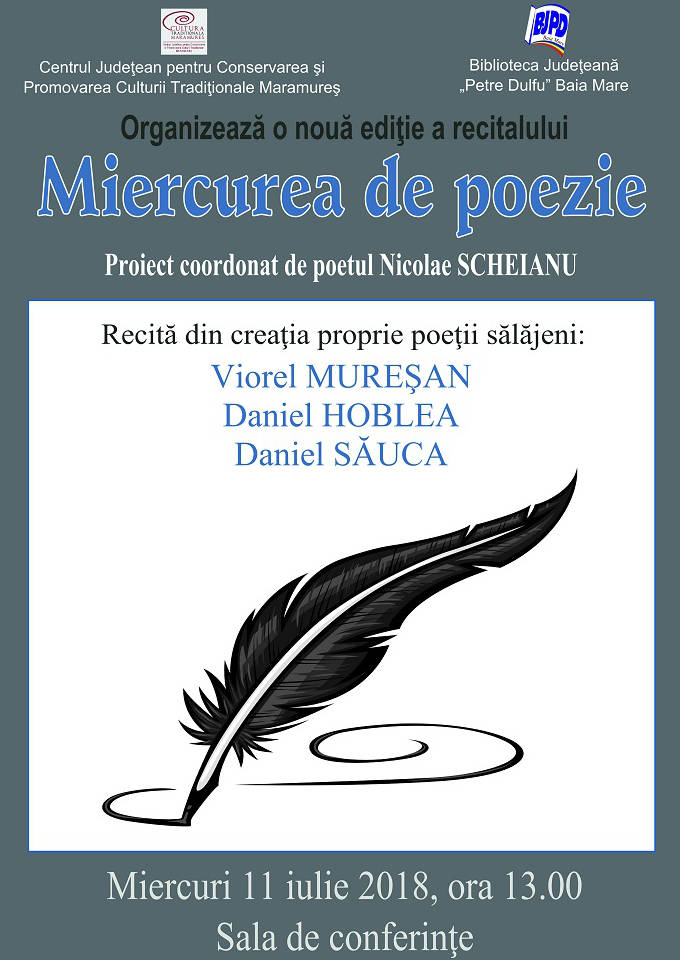 Miercuri, 11 iulie, ora 13.00, la Sala de conferinţe va avea loc o nouă ediţie a recitalului „Miercurea de poezie”, eveniment coordonat de poetul Nicolae Scheianu şi organizat în colaborare de Centrul Judeţean pentru Conservarea şi Promovarea Culturii Tradiţionale Maramureş şi Biblioteca Judeţeană „Petre Dulfu” Maramureş.