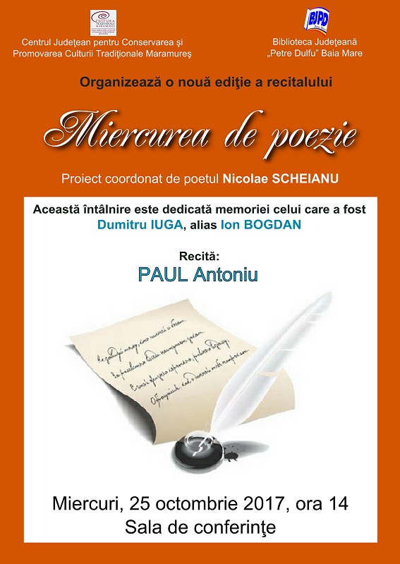 Centrul Judeţean pentru Conservarea şi Promovarea Culturii Tradiţionale Maramureş în colaborare cu Biblioteca Judeţeană „Petre Dulfu” organizează miercuri, 25 octombrie 2017, ora 14, în Sala de conferinţe, o nouă ediţie a recitalului „Miercurea de poezie”, proiect coordonat de poetul Nicolae SCHEIANU.