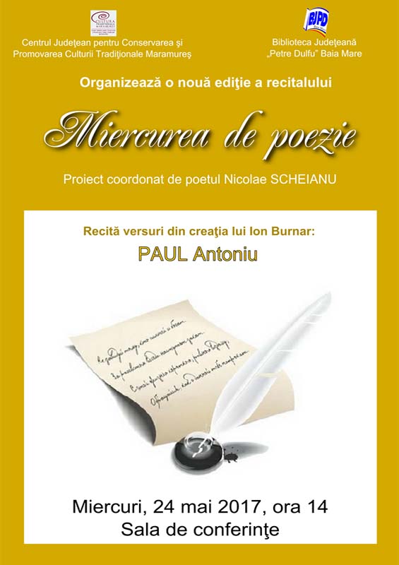 Centrul Judeţean pentru Conservarea şi Promovarea Culturii Tradiţionale Maramureş în colaborare cu Biblioteca Judeţeană „Petre Dulfu” organizează o nouă ediţie a recitalului „Miercurea de poezie„, proiect coordonat de poetul Nicolae Scheianu.