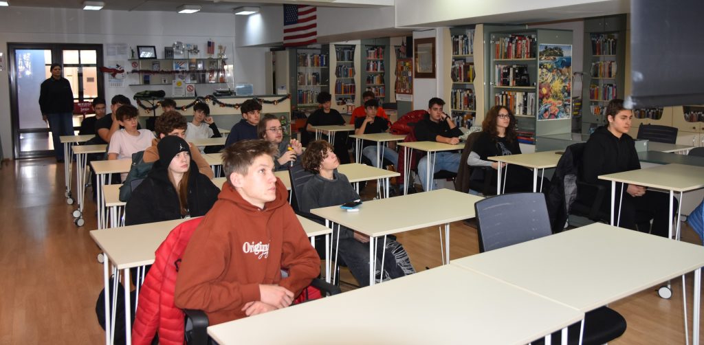 Instantanee de la prima activitate din seria „From Thirteen Colonies to a Global Superpower: The Evolution of America” organizată de American Corner și jurnalistul Dan Coardă. Participanți au fost elevii clasei a X-a B de la Liceul Tehnologic „George Barițiu” din Baia Mare, alături de doamna profesoară de limba engleză, Nicoleta Ungur.