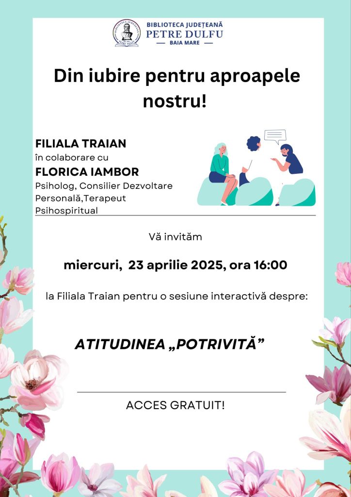 Sursa: Biblioteca Judeţeană „Petre Dulfu” Baia Mare, Filiala „Traian” – Bd. Traian, nr. 6, Baia Mare, | Facebook