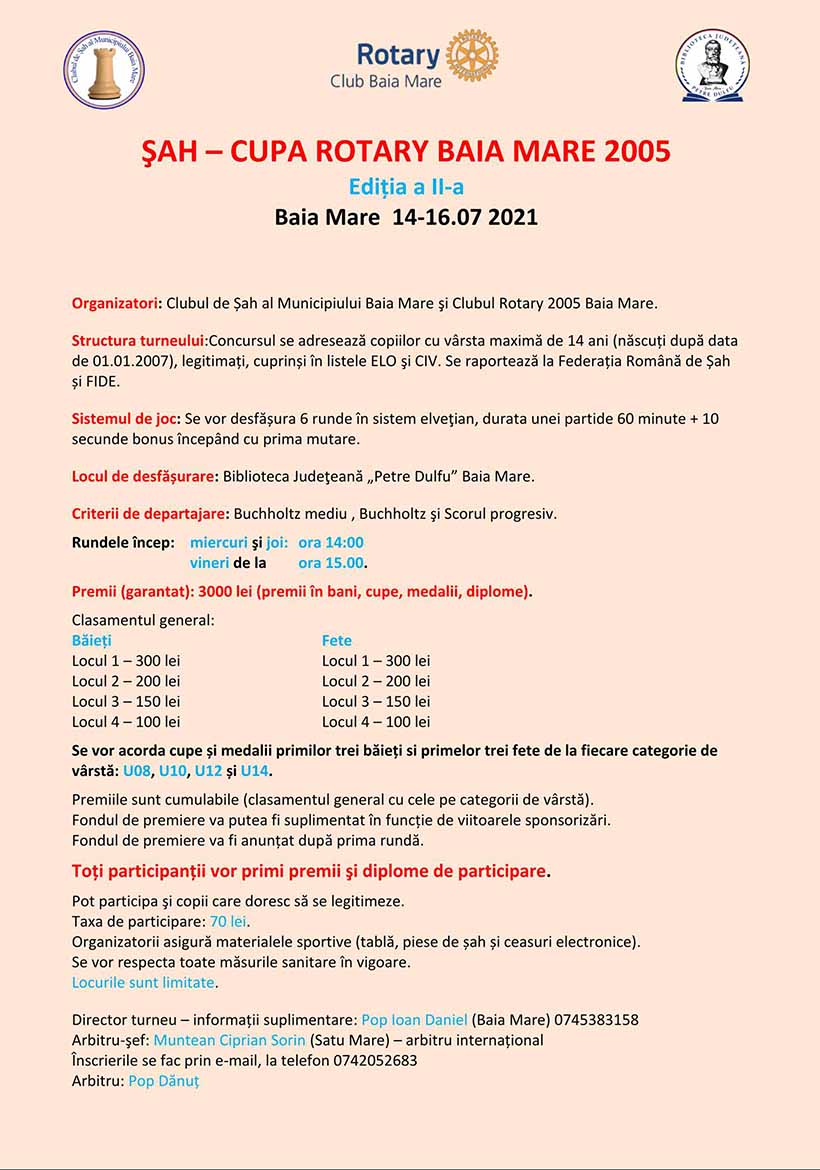 Joi, 15 iulie, de la ora 14.00, în Salonul Artelor, Clubul de șah al municipiului Baia Mare organizează concursul național de șah „Cupa Rotary 2005”.