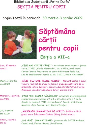 Biblioteca Judeţeană „Petre Dulfu” – SECŢIA PENTRU COPII organizează, în perioada 30 martie-3 aprilie 2009, Săptămâna cărţii pentru copii – Ediţia a VII-a. În program manifestări diverse în colaborare cu şcoli şi grădiniţe partenere.