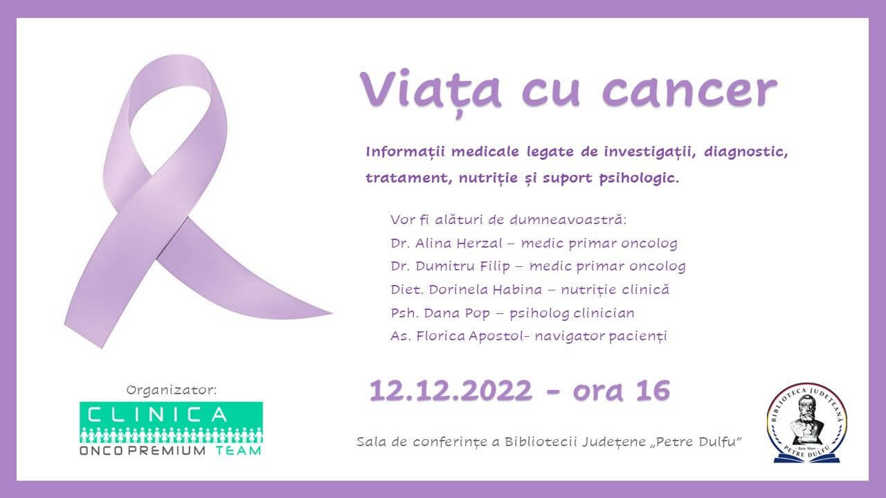 Clinica Oncopremium Baia Mare în colaborare cu Biblioteca Județeană „Petre Dulfu” organizează seminarul informativ „Viața cu cancer”, în cadrul căruia vor fi prezentate informații medicale legate de investigații, diagnostic, tratament, nutriție și suport psihologic.