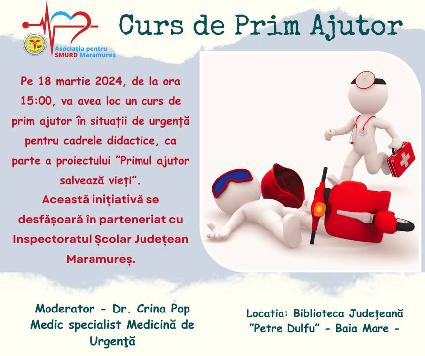 Asociația pentru SMURD Maramureș organizează un curs de prim-ajutor în situații de urgență pentru cadrele didactice, ca parte a proiectului „Primul ajutor salvează vieți”. Această inițiativă se desfășoară în parteneriat cu Inspectoratul Școlar Județean Maramureș.