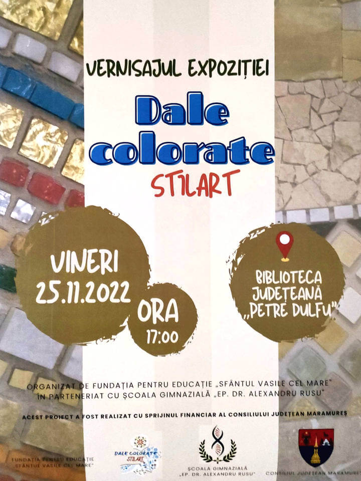 În spaţiul expoziţional al Serviciului Împrumut carte pentru copii şi tineret va avea loc vernisajul expoziţiei de ceramică „Dale colorate”, realizatori: Fundaţia pentru educaţie Sfântul „Vasile cel Mare”, cofinanţat de Consiliul Judeţean Maramureş.