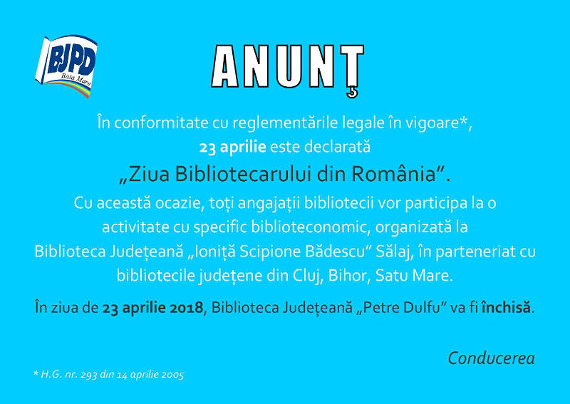 În ziua de 23 aprilie 2018, Biblioteca Judeţeană „Petre Dulfu” va fi închisă.