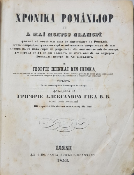 1853. La Tipografia româno-franceză din Iași se tipărește Hronica românilor și a mai multor neamuri de Gheorghe Șincai, în trei volume. Se interesase de lucrare și Mihail Kogălniceanu, care le întreabă în scrisorile trimise din Berlin pe surorile sale din țară despre soarta cărții, cerându-le să o procure. Despre această importantă „carte de identitate românească”, istoricul moldovean aflase încă din perioada în care făcea împreună cu Alecsandri „școală privată” cu călugărul și cărturarul maramureșean Gherman Vida, care trecuse Carpații cu Cronica în traistă. În curentul de idei al timpului, intelectualii din toate provinciile locuite de români „cercetau” o astfel de lucrare ce întreținea mișcarea de redeșteptare națională. De remarcat faptul că Hronica… fusese terminată în 1811, un exemplar fiindu-i trimis în copie episcopului Samuil Vulcan la Oradea. Copia a ajuns (nu se știe cum!) într-o librărie vieneză, fiind cumpărată la licitație, în 1833, de arhimandritul Gherman Vida din Iapa, Maramureș. În 1853, după comemorarea lui Gheorghe Șincai, domnitorul Moldovei, Grigore Ghica, a cumpărat lucrarea de la G. Vida și a tipărit-o, prin grija lui August Treboniu Laurian, care afirmase anterior că, atâta vreme cât această carte rămâne nepublicată, românii nu pot avea istorie!