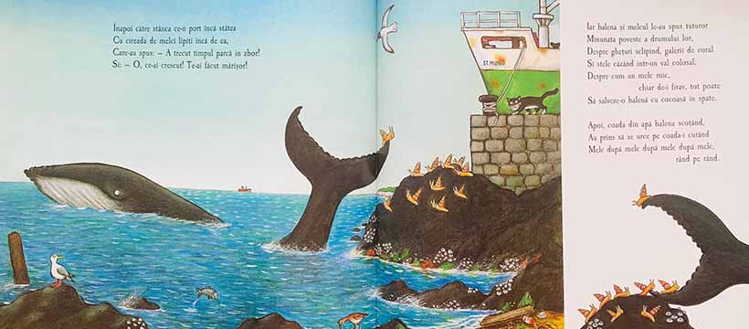 Balenele evocă un sentiment de uimire, admirație și mister. Timp de secole, aceste creaturi au inspirat mulți scriitori să le includă în operele lor. Și n-o să scriu despre Moby Dick aici. Dacă într-un articol precedent am scris despre cartea mea preferată din biblioteca copiilor mei, azi voi prezenta o carte a cuplului meu preferat de autoare-ilustrator, tot din colecția cărților pe care le-am citit împreună cu ei ani de zile: Julia Donaldson și Axel Scheffler. Ilustrațiile vii și simpatice, scrierea în versuri distractive și mai ales traducerea fenomenală a lui Florin Bican – toate acestea ne determină să citim în continuare orice carte nou apărută a acestora, chiar și acum la 9 și 12 ani, și dacă am ieșit din segmentul 3-7 ani recomandat de Editura Cartea Copiilor. Dacă o carte (”Cel mai fain uriaș din oraș”) ne face să râdem și când o citim a zecea oară, trebuie să fie ceva bun acolo…