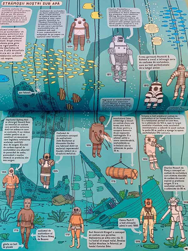 Iar dacă „cei din jur” sunt copii, vin cu o recomandare de carte, deși nu abordează tema protejării apei. În 2016-2017 la Humanitas Junior au apărut câteva enciclopedii pentru copii deosebite, cu un aspect retro de parcă ar fi opere de artă într-un muzeu. Ele chiar fac parte dintr-o colecție numită neoficial „enciclopedii de artă pentru copii”. Acestea nu oferă doar informații valoroase, ci cultivă și simțul frumosului la copii, prin ilustrațiile extraordinare. Când am citit că subiectul Zilei Mondiale a Apei din acest an este „APA SUBterană” mi-a zburat gândul la enciclopedia „Sub pământ. Sub ape”, pe care o puteți împrumuta de la Biblioteca Județeană, de aici. Polonezii Aleksandra Mizielinska și Daniel Mizielinski sunt unii dintre cei mai cunoscuți și apreciați ilustratori europeni ai momentului datorită creativității ieșite din comun.