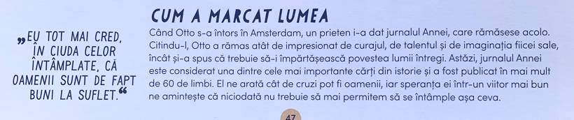 M-au întristat paginile dedicate Annei Frank, nu doar pentru povestea tristă, ci pentru finalul textului, pentru că în 2020, când a fost scrisă această carte, noi toți credeam încă în expresia (adoptată după Al Doilea Război Mondial) „never again”, să cunoaștem istoria bine, ca să n-o mai repetăm: