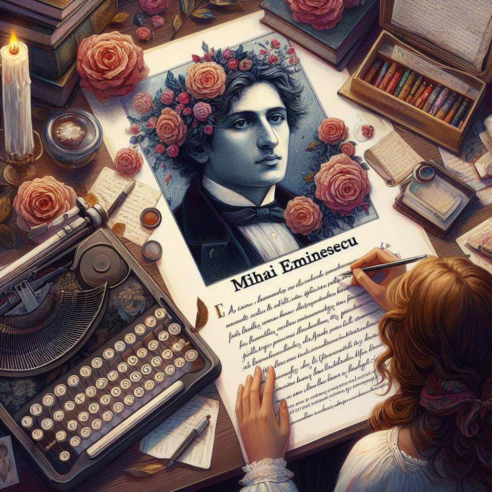 Imagine generată acum de mine prin aplicația DALL·E 2 (a OpenAI), cerând „o imagine care să reprezinte o femeie care scrie un eseu despre Mihai Eminescu” – pe care nu l-a chiar nimerit, neavând voie probabil să folosească imaginile protejate cu copyright ale poetului.