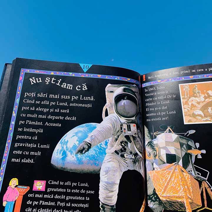 Cât m-am bucurat să vă pot recomanda azi o carte care se îmbină într-un fel toate aceste sărbători! Nu ştiam că poţi sări mai sus pe Lună – şi alte lucruri senzaţionale despre explorarea spaţiului este genul acela de carte de știință pe care ți-ai fi dorit-o când erai mic. Ar fi făcut învățarea mult mai distractivă, și eu simt că aș fi reținut mai multe informații interesante și simpatice astfel, decât prin „lecțiile” clasice. Unele informații sunt atât de greu de crezut, încât veți ajunge, ca mine, să căutați pe internet dacă într-adevăr există costume de astronauți căptușite cu tuburi de apă, pentru răcire, pentru că altfel sângele ar ajunge să fiarbă. Ajungi să te întrebi cât de geniali sunt oameni de știință care lucrează în acest domeniu, să se gândească la toate acestea aici pe pământ, să anticipeze mediul spațial încă dinainte de a ajunge cineva acolo și să simuleze tot ce ar putea să se întâmple.